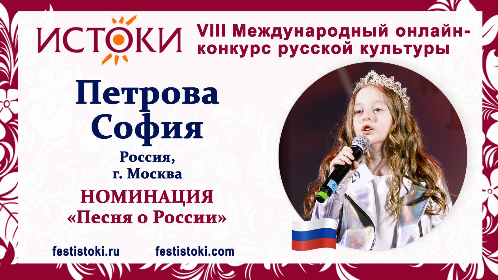 Участник VIII Международного онлайн-конкурса русской культуры "Истоки". Номинация "Песня о России". Песня "Себежаночка". музыка А. Циплияускаса, слова Н.Шитова. Сайт: festistoki.ru / festistoki.com E-mail: festistoki@mail.ru