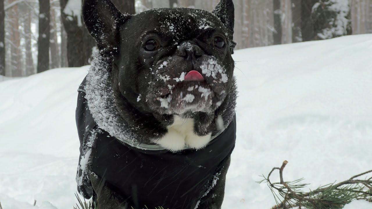 Французский бульдог Олег просто плюхнулся в снег, когда выходил из дома