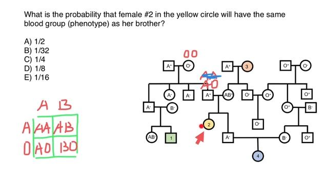 Blood is a remarkable fluid that sustains life by delivering oxygen, nutrients, and essential components throughout the body. Beyond its life-sustaining properties, blood plays a pivotal role in medical procedures like blood transfusions and organ transplantation. The ABO and Rh blood group systems are two key factors that determine blood compatibility, ensuring the safety and success of these medical interventions. The ABO Blood Group System: A Foundation of Compatibility The ABO blood group system, discovered by Austrian immunologist Karl Landsteiner in the early 20th century, is a fundamental classification of blood types based on the presence or absence of specific antigens on the surface of red blood cells. These antigens, namely A and B, are carbohydrates that trigger the immune system's response when they encounter foreign substances. There are four primary ABO blood groups: Blood Group A: People with this blood type have A antigens on their red blood cells and anti-B antibodies in their plasma. They can receive blood from donors with blood groups A and O, and donate to recipients with blood groups A and AB. Blood Group B: Individuals with blood group B possess B antigens on their red blood cells and anti-A antibodies in their plasma. They can receive blood from donors with blood groups B and O, and donate to recipients with blood groups B and AB. Blood Group AB: People with blood group AB exhibit both A and B antigens on their red blood cells and lack anti-A and anti-B antibodies in their plasma. They are universal recipients, capable of receiving blood from donors of any ABO blood group. Blood Group O: Individuals with blood group O have no A or B antigens on their red blood cells but carry both anti-A and anti-B antibodies in their plasma. They are universal donors, able to donate blood to recipients of any ABO blood group. The Rh Blood Group System: The Rhesus Factor Factor The Rh blood group system, named after the Rhesus monkey used in early research, is another critical determinant of blood compatibility. The primary antigen in this system is the Rh factor, also known as the D antigen. People can be either Rh-positive (have the Rh antigen) or Rh-negative (lack the Rh antigen) based on the presence of this antigen. When an Rh-negative individual receives Rh-positive blood, their immune system can produce antibodies against the Rh factor. While the first exposure may not cause harm, subsequent exposures can lead to a potentially severe immune response, endangering the recipient's health. Importance in Medical Procedures Understanding the ABO and Rh blood group systems is essential for safe blood transfusions and organ transplantation. Mismatched blood transfusions can result in agglutination (clumping) of red blood cells, which can obstruct blood vessels and lead to severe complications. Similarly, organ transplantation requires meticulous matching of blood types to prevent rejection and enhance the chances of a successful transplant. In pregnancy, the Rh factor becomes especially significant. If an Rh-negative mother is carrying an Rh-positive baby, the mixing of blood during childbirth can sensitize the mother's immune system, potentially leading to hemolytic disease of the newborn (HDN). This condition can cause severe anemia and other complications in the baby. Conclusion The ABO and Rh blood group systems are critical aspects of blood compatibility that shape medical practices and interventions. Through these systems, healthcare professionals can ensure the safety and success of blood transfusions, organ transplants, and other medical procedures involving blood. By understanding these fundamental concepts, we can continue to advance medical science, improve patient outcomes, and contribute to the well-being of individuals around the world. Problem: What is the probability that female #2 in the yellow circle will have the same blood group (phenotype) as her brother? A) 1/16 B) 1/8 C) 1/32 D) 1/4 ... https://www.youtube.com/watch?v=RFd2dTxVgns