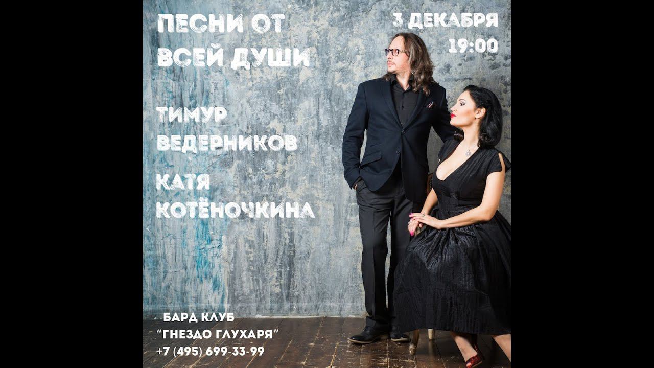 Концерт ко дню рождения Кати Котёночкиной! Тимур Ведерников и Катя Котёночкина. Семейный дуэт выступит с бэндом, в состав которого входят лучшие музыканты Москвы. В Концерте прозвучат всеми любимые душевные песни, песни нашего детства , которые можно петь всем залом и авторские песни Тимура и Кати . Тимур Ведерников - Заслуженный артист Ингушетии , музыкант, мультиинструменталист, композитор, певец, продюсер международного проекта #МУЗЫКАВМЕСТЕ , постоянный участник шоу Андрея Малахова «Привет, Андрей!» и «Песни от всей души». Катя Котёночкина - Актриса, певица, автор песен, лауреат международных конкурсов. Образ Кати точно "попадает " в образ девушки 50 годов . В ней тонкое сочетание западного стиля Пин-ап и элегантной советской сдержанности. Голос и манера исполнения напоминают тёплые ноты Кристалинской, Ведищевой, Миансаровой, Мондрус, Пьехи....