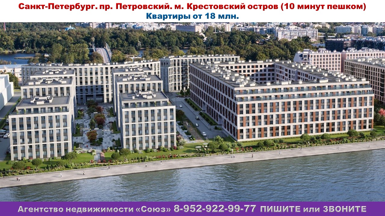 Агентство недвижимости «СОЮЗ» Покупайте: квартиру в Санкт-Петербурге. Петровский пр., м. Крестовский остров (10 минут пешком) Агент по новостройкам: 89529229977 (WhatsApp) Цены на квартиры точно такие же как и у застройщика. Квартиры продаются БЕЗ РИЭЛТОРСКОЙ КОМИССИИ !!!. 1к. квартиры: от 18 млн. руб. Ежемесячный платеж: 111 003 руб. при ставке 8% Площадь общая: 39,2 м2 - 75,8 м2 2к. квартиры: от 23 млн. 309 тыс.100 руб. Ежемесячный платеж: 143 743 руб. при ставке 8% Площадь общая: 58,2 м2 - 81,14 м2 3к. квартиры: от 39 млн. 665 тыс.250 руб. Ежемесячный платеж: 244 608 руб. при ставке 8% Площадь общая: 85,9 м2 - 136,4 м2 4к. квартиры: от 60 млн. 264 тыс. руб. Ежемесячный платеж: 371 637 руб. при ставке 8% Площадь общая: 124 м2 - 129,7 м2 Срок сдачи: сдан Срок выдачи ключей: 1 квартал 2024 Договор: К-П Тип дома: кирпично-монолитный Тип отделки: черновая Парковка: есть Потолки: 3 м. Преимущества:Метро в шаговой доступности. Развитая инфраструктура.Первая линия Невы, своя приватная набережная. Закрытая охраняемая территория. Детские площадки из природных материалов. Собственный ландшафтный сквер. Жилой комплекс в центре города. Первая линия Малой Невы – персональный выход на набережную. Просторные террасы с панорамными видами на парк и Малую Неву. Окна из экологически чистых материалов. Навесной вентилируемый фасад с использованием натуральной керамики. Приток свежего воздуха в квартиры через систему фильтрации в наружных стенах. Скрытые места для установки наружных блоков кондиционеров. Увеличенные оконные проемы – 2,05м. Высота подоконника – 50 см. Окна из сверхтонкого алюминиевого профиля европейского производства. Повышенная звукоизоляция и замки с возможностью перекодировки. Собственный ландшафтный сквер. Зеленый оазис со стильными дорожками, яркими цветами, декоративной подсветкой и высокой пышной елью. Центральная пешеходная аллея с выходом на приватную набережную. Relax-зона с шезлонгами и зонтами для принятия солнечных ванн. Своя приватная набережная. Парадный вход в закрытый внутренний двор через центральный ресепшн с круглосуточным постом охраны. Система видеодомофонной связи с квартирами в каждой парадной. Видео звонок при входе в каждую квартиру В непосредственной близости: 6 детских садов, 2 школы.