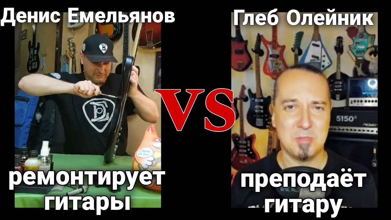Оленьик никак не успокоится, так что разберёмся по фактам. В видео гитары после ремонта Дениса Емельянова и ученики игры на гитаре Глеба. Смотрим и сравниваем - кто есть кто.