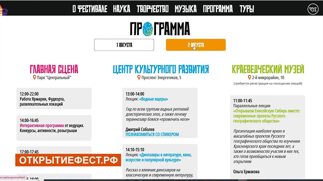 Всероссийский фестиваль про динозавров, науку, творчество и музыку «Открытие» пройдет в Шарыпово 1 и 2 августа. Два дня насыщенной программы, музыки, творчества и знаний в городе Шарыпово! Именно у нас были обнаружены останки ранее неизвестного вида динозавров, что стало настоящим открытием для российской науки. Напомним, что нашел ископаемое наша гордость и знаменитость Сергей Анатольевич Краснолуцкий, научный сотрудник Шарыповского краеведческого музея, художник, скульптор и почетный житель города. Это послужило импульсом к созданию двухдневного Фестиваля, посвященного открытиям не только в науке, но и искусстве, а главное - в современной музыке!