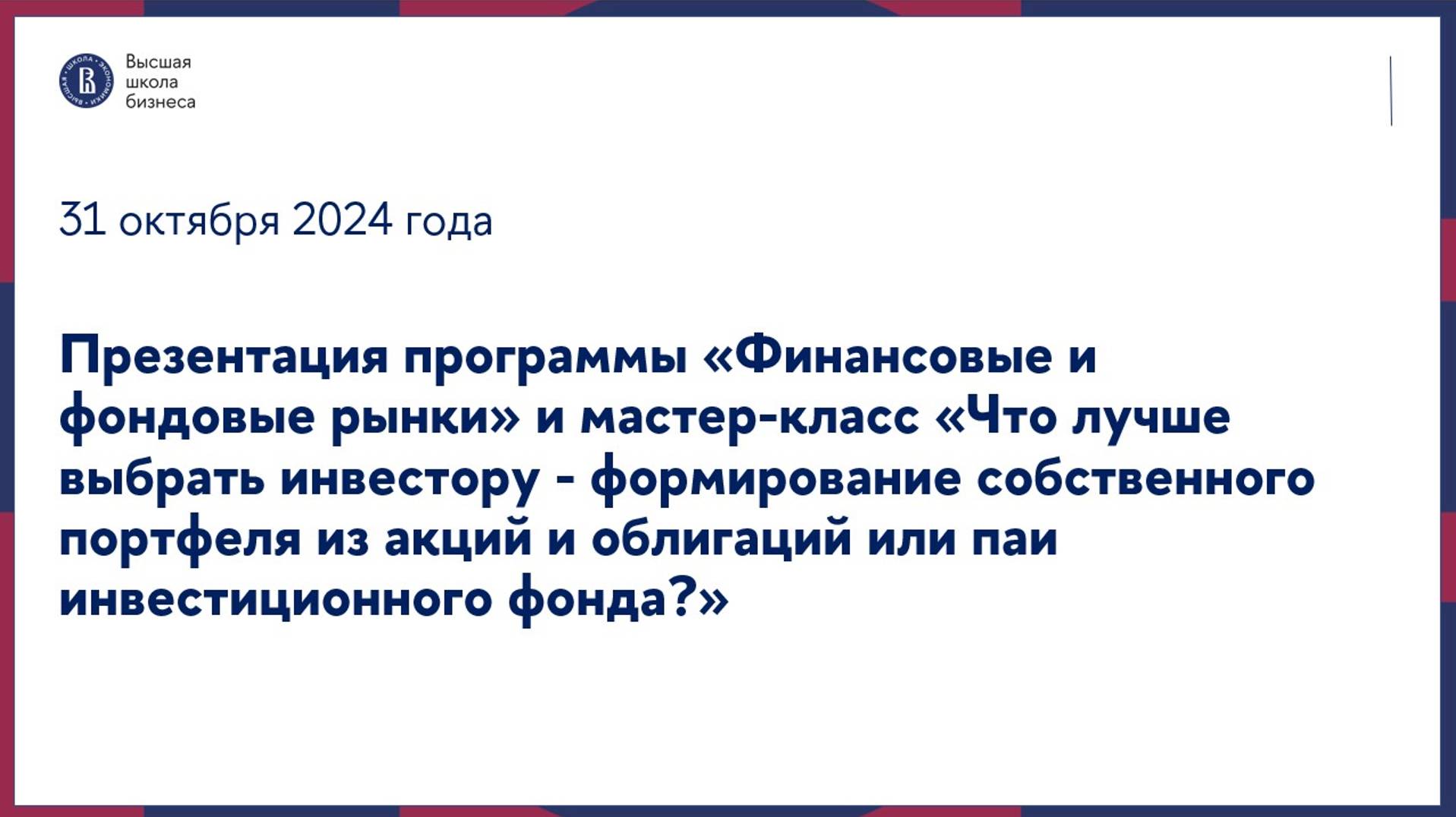 Презентация программы «Финансовые и фондовые рынки» и мастер-класс 31 октября 2024 г.