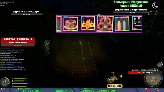 Поддержка донатом https://new.donatepay.ru/@1032463 Альтернативный донат https://www.donationalerts.com/r/kalyamba11 5536913964533059 карта Тинькоф Если стрим лагает,смотри стрим на трово https://trovo.live/s/Kalyamba_na_Ribalke Мой ВК - https://vk.com/kalyantv НИК в игре kalyan11 НАШ ДИСКОРД СЕРВЕР https://discord.gg/3ZeEDGs5h6 Заказ водоема на 1 час - 500р ( весь стрим 2500р ) Модерка на канале 1300р ( каждая следующая на 100р больше) Озвучка доната на 40р,50р,100р,200р,300р,500р,1000р ✅Призы в рулетке "ЗОЛОТАЯ" ✔ ЗОЛОТО ✔ ПРЕМ ✔ КАТУШКИ ЮБИЛЕЙНАЯ БОРЕЛИКА, ВЕНГИ, ТАЙГА, СИЛЬВЕР 80, И другие ✔ ПАЛКИ ПИЛКЕРНАЯ, ДОНКА МОРСКИЕ, ✔ РОД ПОД, СТУЛЬЯ ✅Призы в рулетке СТАНДАРТ : ✔ катушкИ ЮБИЛЕЙНАЯ БОРЕЛИКА, ВЕНГИ, ТАЙГА, СИЛЬВЕР 80, И другие ✔ катушки 60 для медного ( ЭВИИ, НАТОРЫ, ГОЛДА, и тд) ✔ ПИЛКЕРНОЕ УДИЛИЩЕ КОРОЛЕВА ОКЕАНА ✔ Морское Донное удилище ✔ прем ( 3, 7, 30 дней) ✔ золото ( 1, 3, 5, 10, 20 ,50) ✔ билет на море ( 1, 3, 5 дней) ✔ голд наживка и др. ✅Призы в рулетке "СТАРТОВАЯ" ✔ катушка "silver80" ✔ катушка "БЕЛЫЙ КАЛИБР" ✔ катушка "Черный калибр" ✔ катушка "Протон" ✔ катушка "Нарга 6000" ✔ Набор Фидерист и спинингист ✔ Карповик Фортуна ✔ фидерные удилища ✔ прем, золото, алкашка, наживки и тд P.s Рулетка это не казино, а награда за поддержку стримера. Вечный ТОП ПОДДЕРЖКИ (11.05.2024) 1. Dimon_pokemonchik 119 784 2. Interceptor 75 508 3. Skreb79 71 261 4. une personne 68 619 5. Нарвал77 31 550