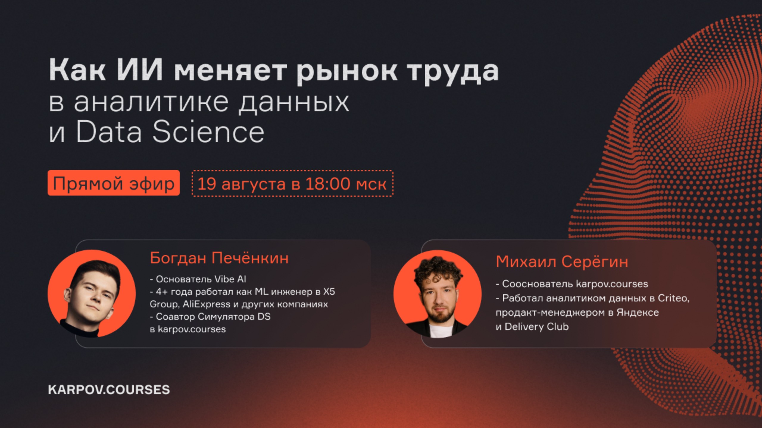 Как искусственный интеллект меняет работу аналитиков и Data Scientist’ов, и что это значит для тех, кто хочет войти в профессию или развиваться в ней? Разбираем вместе с экспертами рынка: Богданом Печенкиным и Михаилом Серегиным Хотите добавить в резюме проект, который можно показать работодателю? Воспользуйтесь промокодом AIBOOST и получите скидку 10% на Симулятор Data Science. Симулятор Data Science — это практика на реальных задачах: — кейсы из разных индустрий, — пет-проект для портфолио, — развитие в области анализа данных, машинного обучения и AI. Оставьте заявку на обучение по ссылке Предложение действует до 21 августа включительно. На эфире поговорим: ▪️ какие задачи аналитиков и DS автоматизирует AI, а где всё ещё нужен человек, ▪️ как изменились требования к специалистам, какие навыки стали обязательными, а какие перестали быть критичными, ▪️ почему владение AI-инструментами и понимание ML открывает новые карьерные траектории, ▪️ как собирать портфолио и прокачиваться так, чтобы быть востребованным, ▪️ и как быстро адаптироваться под новые требования рынка. Спикеры: 📌 Михаил Серёгин — сооснователь karpovꓸcourses, экс-аналитик данных в Criteo, продакт-менеджер в Яндексе и Delivery Club 📌 Богдан Печёнкин — основатель Vibe AI, автор Симулятора Data Science в karpovꓸcourses, ex-ML инженер X5 Group и AliExpress
