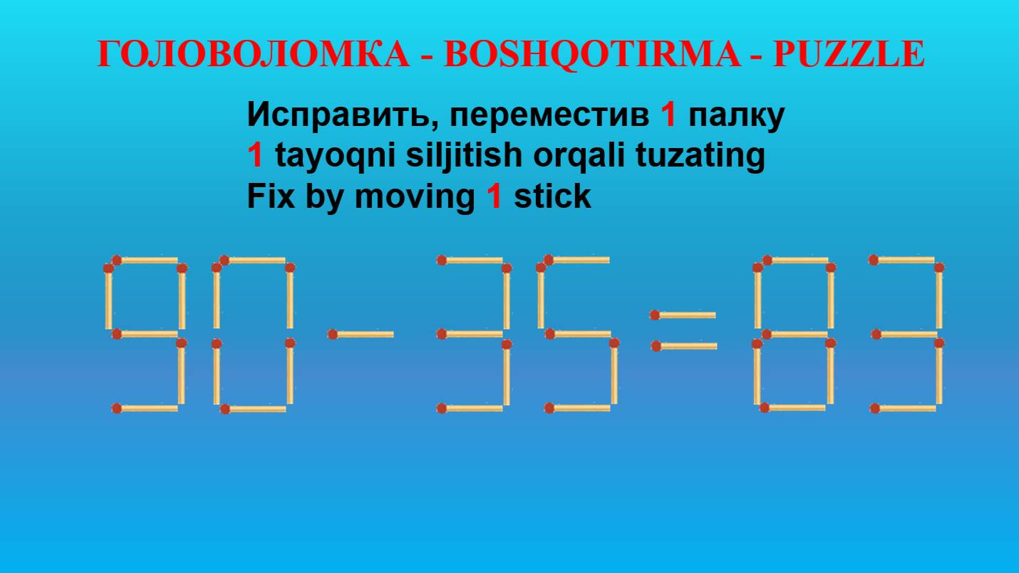 ГОЛОВОЛОМКА - BOSHQOTIRMA – PUZZLE. Спичка. 50+33=25, 83-32=95, 80-38=58, 90-35=83