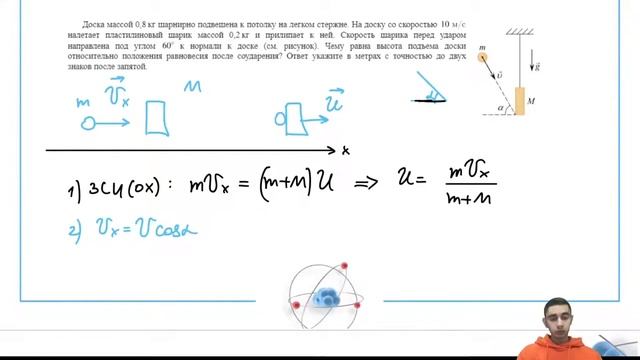 Доска массой 0,8 кг шарнирно подвешена к потолку на легком стержне. На доску со скоростью - №30138