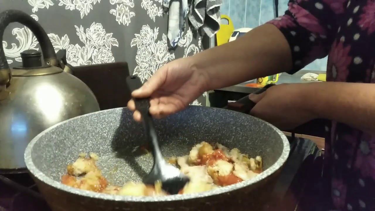 Жарю бекон с луком,томаты свежие,кусочки хлеба,соль, перец и все заливаю яйцом.