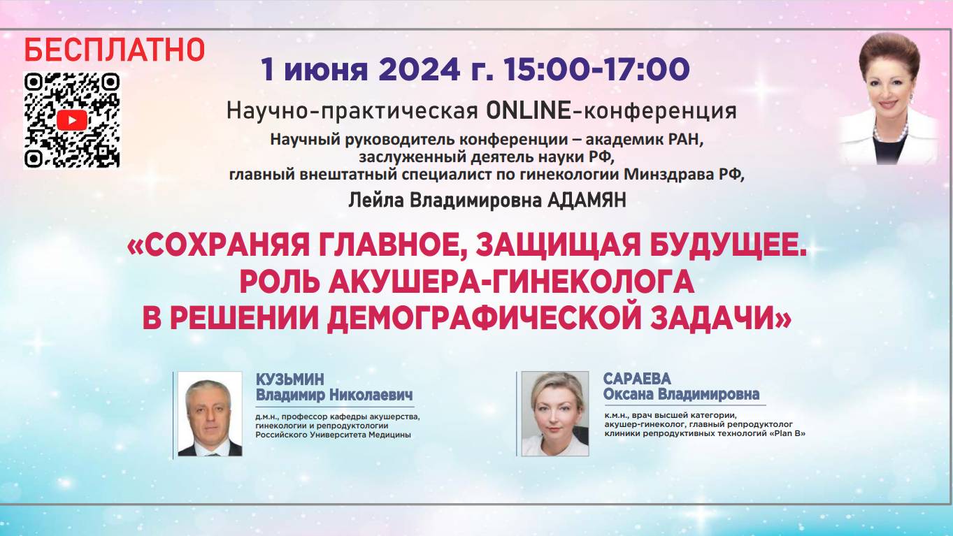 Уважаемые коллеги, мы проводим нашу конференцию в очень символический день - 1 июня, День защиты детей! И конечно, никто не станет опровергать тот факт, что врач акушер-гинеколог стоит у истоков зарождения новой жизни. Сейчас, когда, в целом, репродуктивное здоровье не становится лучше в связи с поведенческими факторами, с факторами внешней среды, а также сдвигаются возрастные границы для создания семьи и реализации репродуктивных планов, мы все больше сталкиваемся со сложностями в ведении наших пациентов. Осложненная беременность стала почти нормой. И задача врача акушера-гинеколога найти оптимальные подходы, чтобы сохранить беременность. В тех случаях, когда мы сталкиваемся со сложностями в зачатии, с бесплодием в паре мы должны использовать все возможности современной медицины для получения долгожданной беременности и здесь нам приходят на мощь вспомогательные репродуктивные технологии. На нашей сегодняшней конференции мы обсудим, как вести пациенток с угрозой потери беременности на ранних сроках, что предпринять, если у пациентки уже есть в анамнезе потери беременности. Также обсудим ситуации, когда не стоит ждать – ведь своевременное обращение к врачу-репродуктологу увеличивает шансы на успешное материнство. Наши докладчики поделятся самой актуальной и практически полезной информацией, которая позволит вам принять правильное решение в вашей ежедневной работе. Научный руководитель конференции: Адамян Лейла Владимировна Академик РАН, заслуженный деятель науки, главный внештатный специалист по гинекологии Минздрава РФ Спикеры: Кузьмин Владимир Николаевич - д.м.н., профессор кафедры акушерства, гинекологии и репродуктологии Российского Университета Медицины Сараева Оксана Владимировна - к.м.н., врач высшей категории, акушер-гинеколог, главный репродуктолог клиники репродуктивных технологий «Plan B» Программа конференции: 1) «Ведение беременности на ранних сроках у пациенток с отягощенным акушерским анамнезом» ( Кузьмин Владимир Николаевич ) 2) «Вспомогательные репродуктивные технологии – современные тренды и где точки соприкосновения акушера-гинеколога и репродуктолога?» ( Сараева Оксана Владимировна ) «Дискуссия. Ответы на вопросы» Адамян Л.В., Кузьмин В.Н., Сараева О.В.
