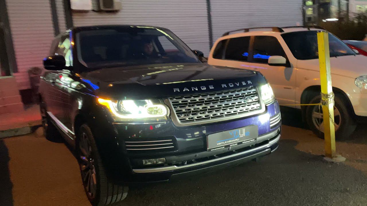 Range Rover Vogue 2018 года. Заказали и заменили стёкла фар. Установили bi-led модули Aozoom A3 max вместо штатного ксенона. Забронировали полиуретановой плёнкой фары. Наш сайт: https://vinylkazan.ru