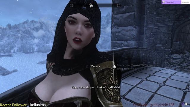 Watch as Serana romances the Dragonborn and proposes. The Dragonborn makes Lydia stand against the wall and watch.
