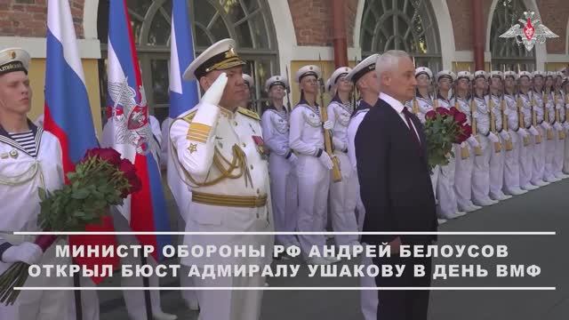 Смотрите плейлист Минобороны России новости https://rutube.ru/plst/1044565 Министр обороны Российской Федерации Андрей Белоусов в день Военно-Морского Флота открыл на территории Адмиралтейства в Санкт-Петербурге бюст великому русскому флотоводцу адмиралу Ушакову. «Федор Ушаков вошел в историю как непревзойденный морской стратег. Его выдающиеся победы показали всему миру силу духа и мощь русского флота», – сказал глава военного ведомства. Министр обороны отметил, что адмирал Ушаков защитил интересы России, укрепил ее морской потенциал и приумножил международное влияние. Он проявил себя как талантливый наставник, душой болел за своих подчиненных, уделял большое внимание воинской подготовке моряков. «Открывая бюст адмирала Ушакова, мы закладываем аллею морской славы в сквере Главного Адмиралтейства», – подчеркнул Андрей Белоусов. В завершении церемонии глава военного ведомства вручил государственные награды военнослужащим Военно-Морского Флота, отличившимся при выполнении боевых задач в зоне проведения специальной военной операции. Военнослужащие, проявившие мужество, отвагу и героизм, были удостоены ордена Александра Невского, медалей ордена «За заслуги перед Отечеством» II степени и медали Суворова.