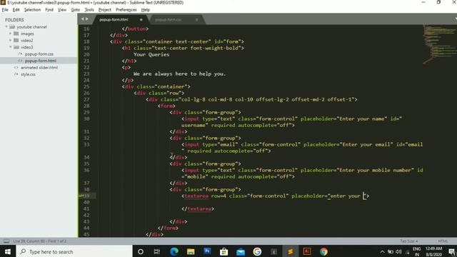 Hey guys welcome to our channel. In this tutorial you will learn :- • Popup form using HTML, CSS and JS. • popup form on button click. • Button click popup form. • Fully responsive popup form. Other videos :- 1. Animated slider using HTML, CSS and JS : https://youtu.be/C4qw4klCkqE 2. Darktheme using HTML, CSS and JS : https://youtu.be/1D1f11zVvYo Source code link : https://www.we3developers.com/#ourdesigns Bootstrap file : https://www.getbootstrap.com/ Font-awesome file : https://cdnjs.com/ If you have any type of querry related to our videos then you can ask us in the comment section. Also suggest us topics on which you want videos from us. Like and follow us : • Facebook : https://www.facebook.com/we3developers/ • Instagram : https://www.instagram.com/we3developers/ • Twitter : https://www.twitter.com/we3developers/ #popup-form #html5 #JS
