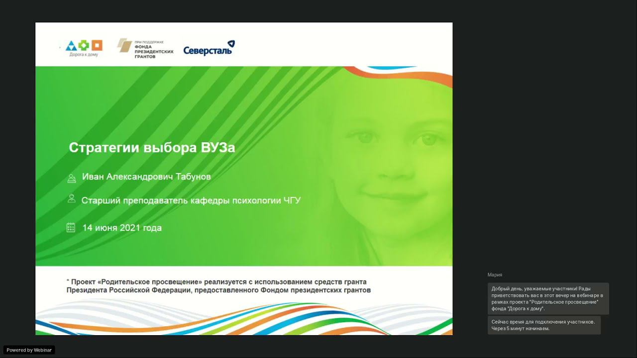 Тема онлайн встречи - «Стратегии выбора вуза». Ведущий — Иван Табунов, старший преподаватель кафедры психологии Череповецкого государственного университета. 0:00 - начало вебинара 3:19 – о темах вебинара 4:46 – зачем вообще поступать в вуз 6:26 – стратегии выбора вуза 12:29 – выбор, основанный на имени вуза 16:01 – выбор, основанный на направлениях подготовки 17:39 – есть ли идеальные стратегии выбора вуза 22:00 – что важно в выборе вуза 30:56 – каким должен быть сайт вуза 38:13 – ошибки при выборе вуза 42:53 – о днях открытых дверей и группах в соцсетях 52:16 – итоги и ответы на вопросы Справка: мероприятие состоялось в рамках проекта «Родительское просвещение» БФ «Дорога к дому» компании «Северсталь» с использованием гранта Президента РФ на развитие гражданского общества, предоставленного Фондом президентских грантов.
