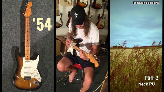 Comparison: 18 Original Fender Stratocasters. We will play three riffs for all guitars using all three pickups (Bridge, Middle, Neck). Use the time tags below to compare what you are interested in. Here's the link to the full clip with all 18 guitars: https://www.youtube.com/watch?v=Un0WQQd0wWY 1. 1954 Fender Stratocaster 2. 1955 Fender Stratocaster 3. 1956 Fender Stratocaster 4. 1957 Fender Stratocaster, Mary Kaye 5. 1958 Fender Stratocaster, Hard Tail 6. 1959 Fender Stratocaster 7. 1960 Fender Stratocaster 8. 1961 Fender Stratocaster 9. 1962 Fender Stratocaster 10. 1963 Fender Stratocaster 11. 1964 Fender Stratocaster 12. 1965 Fender Stratocaster 11. 1964 Fender Stratocaster 12. 1965 Fender Stratocaster 13. 1966 Fender Stratocaster 14. 1967 Fender Stratocaster 15. 1969 Fender Stratocaster 16. 1971 Fender Stratocaster 17. 1973 Fender Stratocaster 18. 1974 Fender Stratocaster Riff1: 1954 Stratocaster Bridge 01:21 Middle 02:07 Neck 03:04 1955 Stratocaster Bridge 01:28 Middle 02:16 Neck 03:12 1956 Stratocaster Bridge 01:36 Middle 02:23 Neck 03:20 1957 Stratocaster Bridge 01:44 Middle 02:32 Neck 03:32 1958 Stratocaster Bridge 01:52 Middle 02:43 Neck 03:46 1959 Stratocaster Bridge 02:01 Middle 02:52 Neck 04:02 Riff2: 1954 Bridge 04:14 Middle 04:45 Neck 05:16 55 Bridge 04:21 Middle 04:51 Neck 05:22 56 Bridge 04:25 Middle 04:57 Neck 05:27 57 Bridge 04:30 Middle 05:01 Neck 05:32 58 Bridge 04:35 Middle 05:05 Neck 05:37 59 Bridge 04:40 Middle 05:11 Neck 05:42 Riff3: 54 Bridge 05:47 Middle 07:42 Neck 09:42 55 Bridge 06:03 Middle 07:59 Neck 10:00 56 Bridge 06:20 Middle 08:18 Neck 10:17 57 Bridge 06:40 Middle 08:38 Neck 10:36 58 Bridge 07:02 Middle 09:00 Neck 10:52 59 Bridge 07:22 Middle 09:20 Neck 11:09 The guitars are played through an original 1959 Fender Bassman.