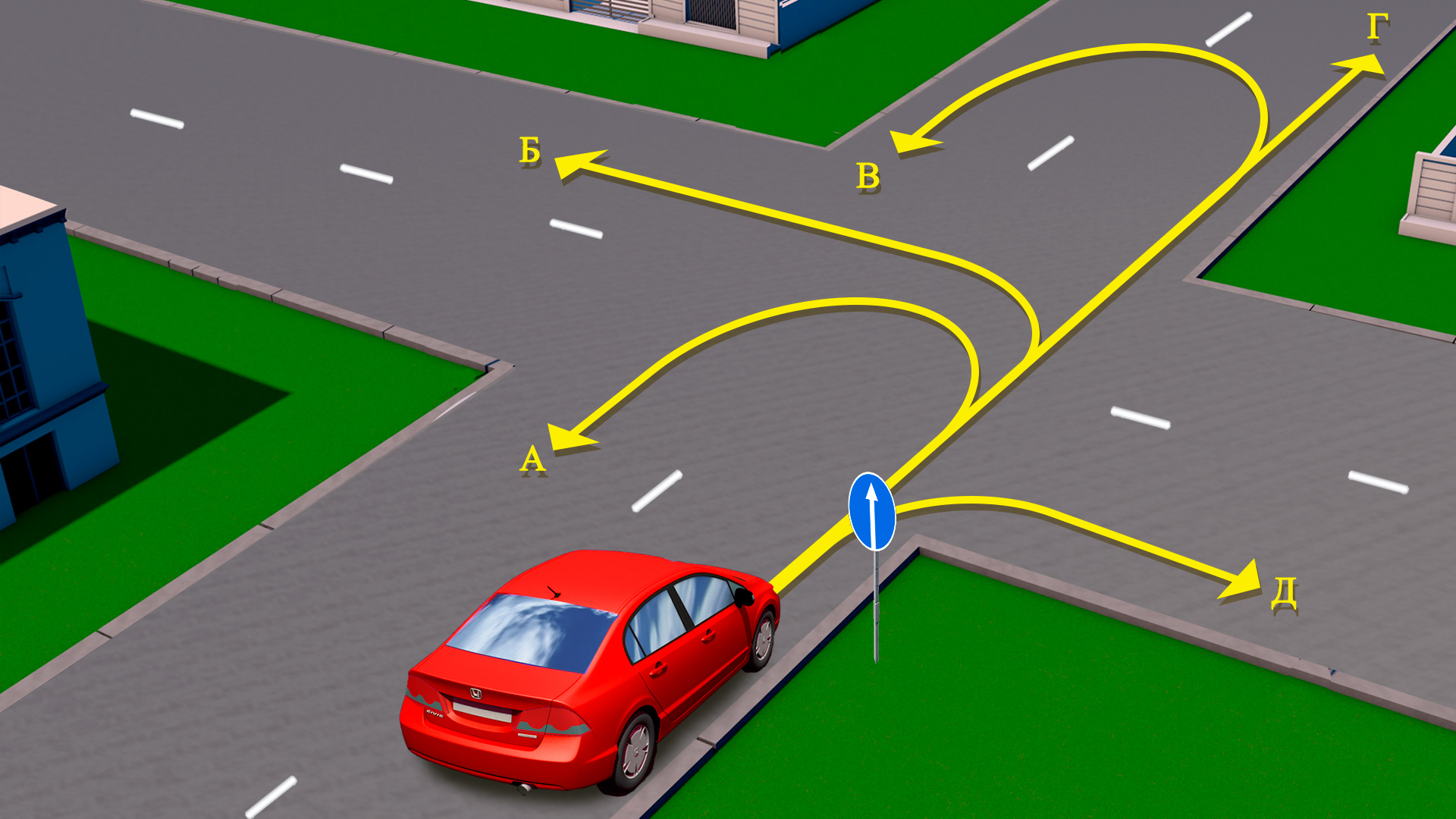 Для того чтобы определить запрещенные траектории для движения. Необходимо разобраться с особенностями участка дороги по которому движется наш водитель, и обратить внимание на требования предписывающего знака. Решите эту задачу сами и поделитесь задачей с друзьями. Возможно, им тоже будет интересно?