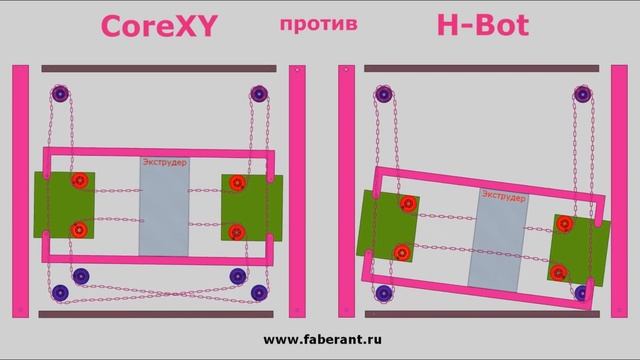 В этом видео с физической симуляцией мы наглядно покажем недостатки кинематики H-Bot и преимущества CoreXY. Как видно на симуляции, единственное направление в кинематике H-Bot, где не происходит перекоса - это движение по оси Y (вверх-вниз на видео). Во всех других случаях, а это движение по оси X (вправо-влево), движение по диагоналям, - систему H-Bot перекашивает. Каждый такой перекос создает большое усилие на все элементы конструкции, что может приводить со временем к повышенному износу деталей. Единственный способ сохранить качество печати в этой кинематике на приемлемом уровне - это использовать дорогие линейные направляющие высокого качества, которые смогут сдерживать перекосы. Естественно, принтер в таком случае также может стоить дороже. При этом видно, что в более сложной кинематике CoreXY, при движении по всем направлениям, сохраняется стабильность, перекосы отсутствуют. Именно поэтому, принтеры на CoreXY могут печатать с высоким качеством на цилиндрических направляющих, которые дешевле линейных. Поэтому стоимость принтера на CoreXY может быть ниже, а ресурс кинематики - выше, чем у H-Bot. Также мы усовершенствовали CoreXY, адаптировав для нее нашу оригинальную систему удвоения точности. Новая система называется FCoreXY и совмещает все достоинства CoreXY, плюс еще лучшая точность при печати. Система используется в нашем 3D-принтере Faberant Cube. Подробнее о принтере на кинематике FCoreXY на нашем сайте www.faberant.ru