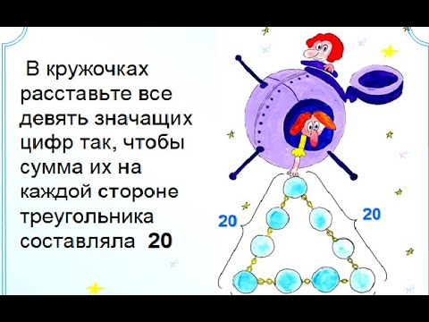 В кружочках расставьте все девять значащих цифр так, чтобы сумма их на каждой стороне треугольника составляла 20.