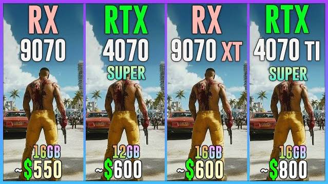 RX 9070 vs RTX 4070 SUPER vs RX 9070 XT vs RTX 4070 TI SUPER - Test in 25 Games 1080p, 1440p, 2160p, 4k, 2k, dlss 4, dlss 3.7 fsr 4, fsr 3.1, ray tracing, frame generation, native, Multi Frame Generation ⏩GPUs & Amazon US⏪ (Affiliate links) 💥RX 9070 16GB: https://amzn.to/4i1WalR 💥RTX 4070 SUPER 12GB: https://amzn.to/3tUYCa5 💥RX 9070 XT 16GB: https://amzn.to/4bxyEKX 💥RTX 4070 TI SUPER 16GB: https://amzn.to/3vDZ9gT ⏩PC Setup⏪ - OS: Windows 11 Professional 64-bit - CPU: Ryzen 7 9800X3D - MB: GIGABYTE X870 AORUS Elite - RAM: Corsair Vengeance RGB 32GB DDR5 - 6400 Mhz CL32 💁♂️ When you buy from my Amazon links, I earn a small commission at no extra cost to you, plus you support the channel thank you.