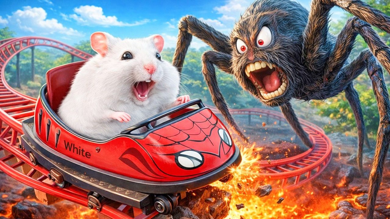 «Остросюжетное приключение начинается! 🐹🕷️ Хомяк оказывается в запутанном лабиринте с элементами американских горок — и за ним охотится ядовитый паук! Что вас ждёт в этом видео: напряжённая погоня: паук стремительно преследует хомяка по извилистым дорожкам; экстремальные спуски и виражи на миниатюрных американских горках; хитрые ловушки и неожиданные повороты лабиринта; моменты, когда хомяк чудом избегает опасности; динамичная съёмка с разных ракурсов — от вида сверху до камеры «от первого лица». Понаблюдайте за этой захватывающей гонкой на выживание! Пишите в комментариях: кто, по‑вашему, победит — шустрый хомяк или коварный паук? 👇»