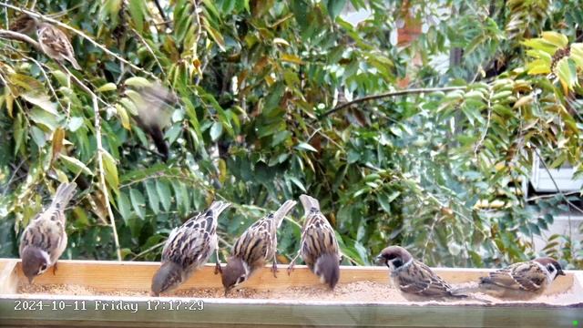 Воробьи в большой кормушке