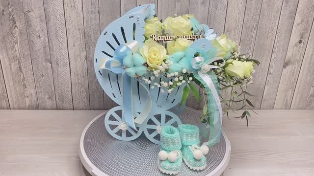 Цветы в деревянной коляске на выписку мальчика