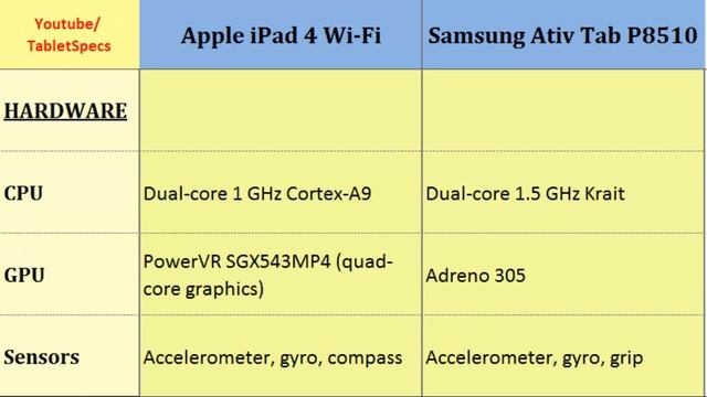 Apple iPad 4 Wi-Fi - Samsung Ativ Tab P8510, Quick Comparison : iPad 4 Wi-Fi over Ativ Tab P8510, Mobile Phone Review and Specs Comparison ; Dual-core, 1 GHz Cortex-A9, 1536 x 2048 pixels, 9.7 inches, Dual-core, 1.5 GHz Krait, 1366 x 768 pixels, 10.1 inches, Camera, Network, Processor, Dimensions, Battery Life, GPS ... Dont forget to Subcribe