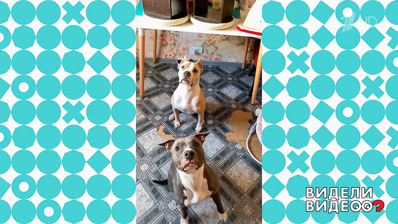 Стаффордширские терьеры Шива, Винюша и Лекс, а также кот Фини и даже младенец собрались на кухне рядом с хозяйкой. А все потому, что она режет очень вкусное мясо!