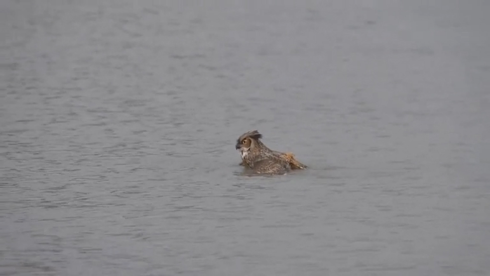 Виргинский филин плывет на озере Мичиган, США