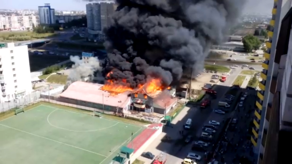 В Барнауле 28 мая 2016 года произошел крупный пожар - загорелся стадион "Коммунальщик". Причина пожара выясняется.