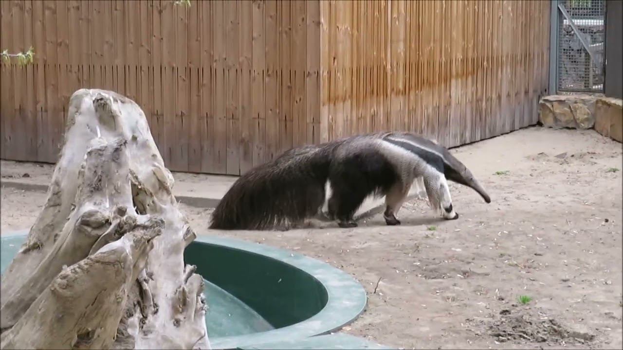 Пара гигантских муравьедов прибыла в Новосибирский зоопарк в 2020 году из зоопарка города Нюкеебинг-Морс (Дания). Наших гигантских муравьедов зовут Калле и Майя. Пара была сформирована несколько лет назад, у них уже рождались детеныши. 11 марта 2022 года родился детеныш краснокнижного гигантского муравьеда у нас в зоопарке. Их купают под душем в соседней комнате. Гигантский муравьед — самое крупное животное в отряде неполнозубых, длина его тела составляет 110-130 см. У него нет зубов, а язык достигает в длину 60 см — он нужен муравьеду для добычи корма. Животное разрушает термитники и муравейники, и языком, смоченным липкой слюной, быстро собирает насекомых. Кормят муравьеда однородной смесью фруктов, геркулеса, личинок насекомых, собачьего корма, торфа и других компонентов.