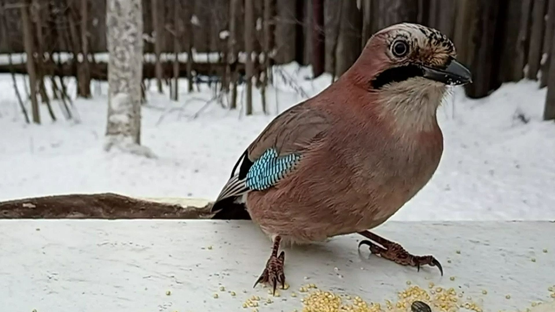 На кормушку прилетели Большие Синицы, Воробьи, Лазоревки и Сойки