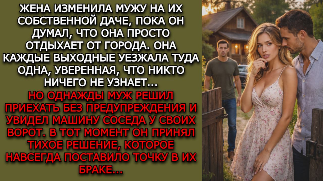 Оксана всё чаще уезжает на дачу одна. Она говорит мужу, что просто хочет отдохнуть от города, заняться садом и побыть в тишине. Сначала Илья не видит в этом ничего странного — у каждого человека бывает желание на время уехать подальше от шума и суеты. Но со временем эти поездки становятся слишком регулярными. Каждые выходные она собирает сумку и снова едет на дачу, возвращаясь спокойной и даже немного отстранённой. Одна случайная фраза соседа заставляет Илью задуматься о новом человеке, который недавно появился в садовом товариществе. Однажды Илья решает поехать туда без предупреждения. Он просто хочет убедиться, что его сомнения — всего лишь ошибка. Но у ворот их дома он видит чужую машину. И именно в этот момент становится ясно, что на даче происходило то, о чём ему никто не собирался рассказывать. Это история о том, как одно решение может разрушить годы доверия. Иногда правда открывается без признаний и без громких сцен — достаточно одного взгляда, чтобы понять всё. Подписывайтесь на канал Голос Истории, если вам близки такие напряжённые жизненные истории о выборе, предательстве и последствиях. ____________________________________ #истории #жизненныеистории #измена #изменажены #предательство #отношения #семья #развод #любовныйтреугольник #жизненнаядрама #психологияотношений #историиизжизни #предательствовсемье #правдаобизмене #мужижена #семейнаядрама #сложныйвыбор #дача #сосед #голосистории