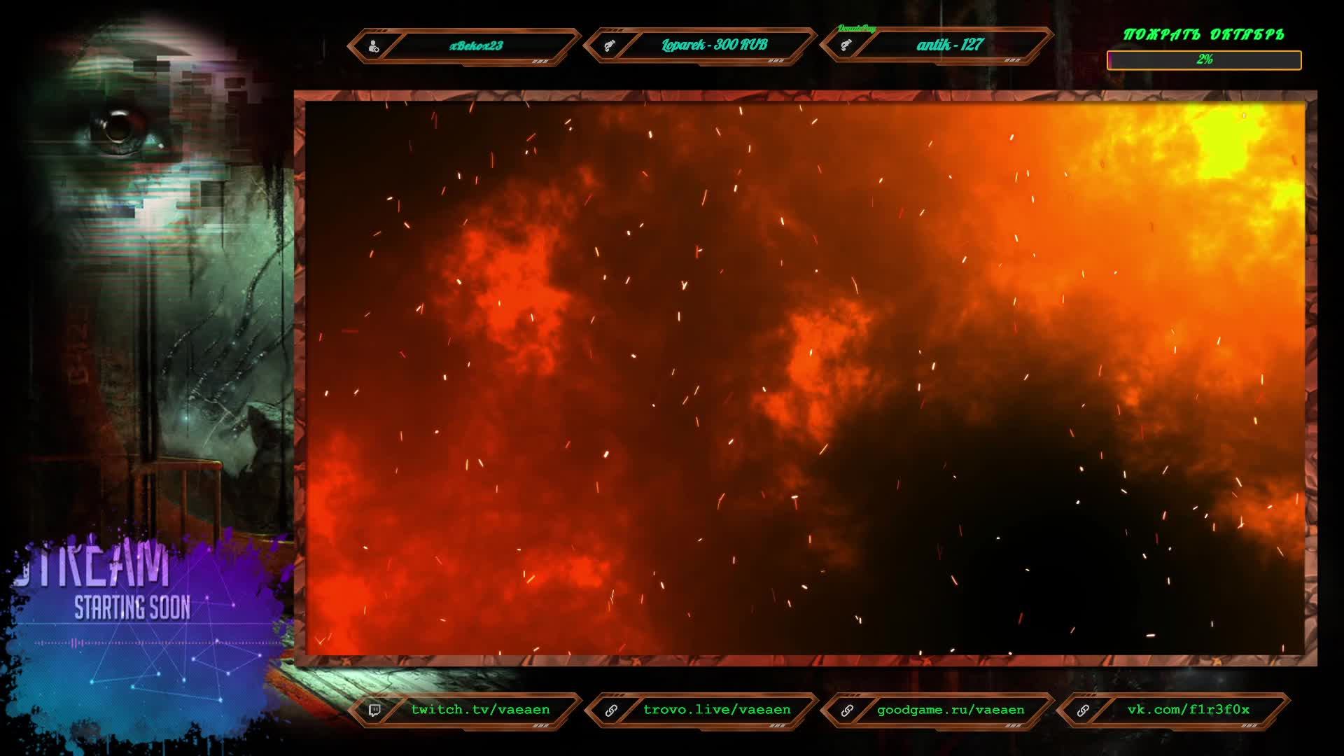 Если хотите поддержать меня как стримера - нажмите по данной ссылке https://www.donationalerts.com/r/f1r3f0x Donate for USD, EU all world - https://new.donatepay.ru/@vaeaen Во время стрима ваше сообщение появится на экране, и будет сопровождаться голосовым диктором. Поддержка на Boosty https://boosty.to/vaeaen Поддержка без комиссии: Сбер: 2202 2010 0629 1039 Тинькофф: 2200 7008 4677 0625 Основные каналы: Twitch: https://www.twitch.tv/vaeaen Trovo: https://trovo.live/Vaeaen GoodGame: https://goodgame.ru/channel/Vaeaen/ VKplay: https://vkplay.live/vaeaen Wasd: https://wasd.tv/vaeaen YouTube: https://www.youtube.com/channel/UCsl3CyRcImUYtWiCgEdvmjQ