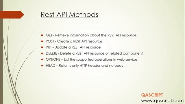 Learn more about Rest API. REST stands for Representational State Transfer. For an API to be RESTful, it must adhere to the following rules: 1. Stateless 2. Uniform Interface 3. Client-Server 4. Cache 5. Layered Different Rest API methods - Get, Post, Put, Delete, Options, Head Found this video interesting - Please Like and Share the video. Have Feedback/Questions - Leave a comment below. Subscribe our YouTube Channel - https://www.youtube.com/channel/UC6LyUhddo6bH2CcFLpFjjsA/ Get access to 100 plus videos on different automation tools. Also never miss out on any new video posted on our channel. Other Video Playlists on our Channel: Selenium: https://www.youtube.com/playlist?list=PLox9xfUeaKQ5qVlG-GyYZHLQCWm4ePMPc Jenkins 2.0: https://www.youtube.com/playlist?list=PLox9xfUeaKQ6lVnKnDRLVsofBHx0FpJcP Maven: https://www.youtube.com/playlist?list=PLox9xfUeaKQ7iBCaDw5MQsmPZUa5gRmCp Blog Site: https://qascript.com