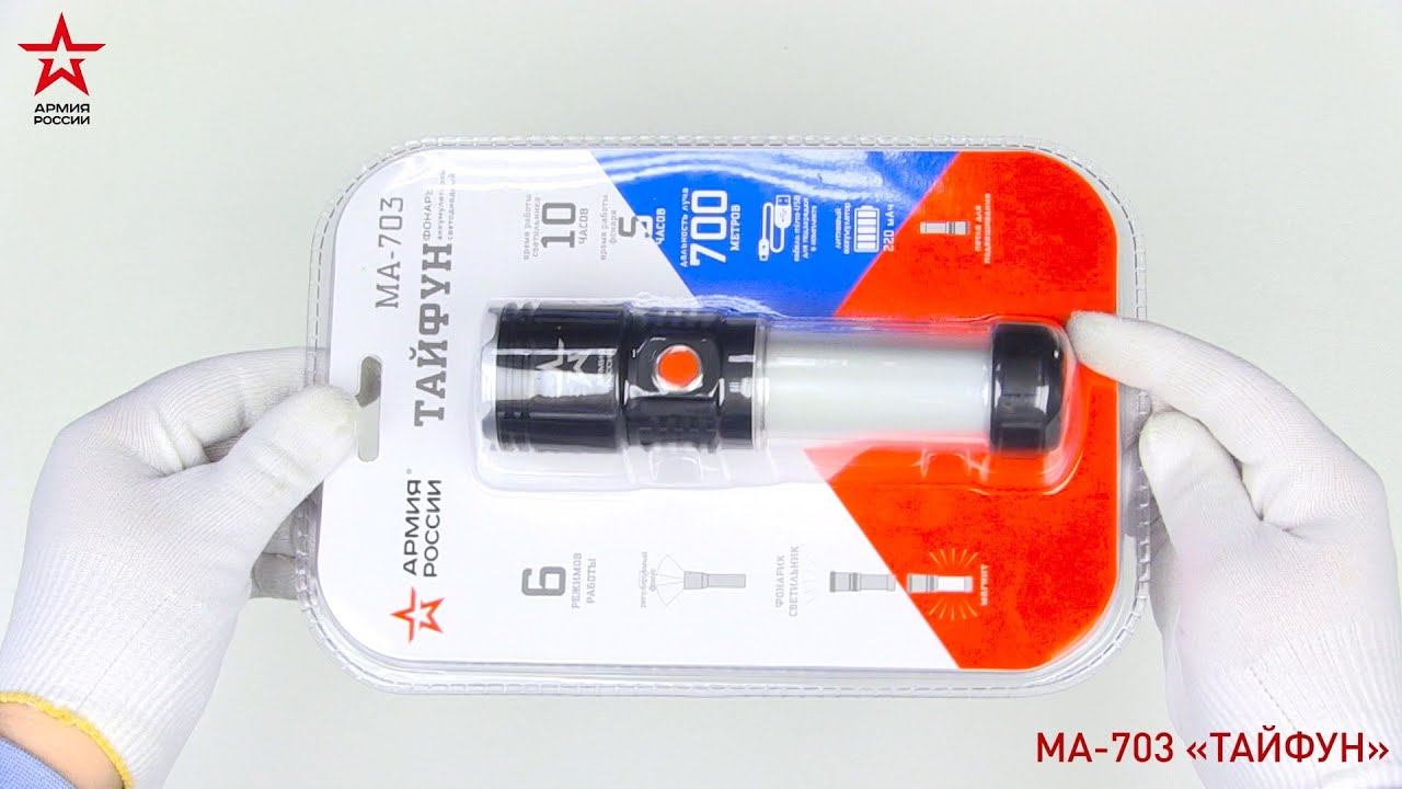 ЭРА Армия России "Тайфун" МА-703 - универсальный светодиодный аккумуляторный фонарь с лучом повышенной дальности, пятикратным зумом и встроенным светонакопителем. Его легко найти в темном помещении или в траве - после выключения сохраняет небольшое свечение. Серия фонарей ЭРА Армия России - совместный проект отечественного бренда ЭРА и АО "Военторг", действующего на основании лицензии Министерства обороны РФ. Фонарь оснащен емким литиевым аккумулятором (2100 мАч), одного заряда хватает на 15 часов непрерывной работы. Зарядное устройство в комплекте. Светодиодный луч повышенной дальности имеет возможность фокусировки. Пять режимов, удобных пользователю - от ближнего заливающего света (для того, чтобы хорошенько осмотреться в темноте) до длинного направленного луча (чтобы определиться с дальнейшим направлением пути). Ручка фонаря Армия России "Тайфун" светится белым и красным светом. Есть режим мерцания. ЭРА Армия России Тайфун выглядит отлично! Благодаря необычному фактурному дизайну корпуса и тщательной сборке его приятно держать в руках, а за счет продуманного функционала им приятно пользоваться. Фонарь украшает фирменная звезда Армии России - знак качества и особого статуса бренда. Аккуратная красная кнопка включения - дополнительный дизайнерский бонус. Светодиодный фонарь АРМИЯ РОССИИ MA-703 "Тайфун" ручной, аккумуляторный,10Вт, 6 режимов, Li аккумулятор, магнит, крючок В онлайн-каталоге ЭРА: https://www.eraworld.ru/catalog/2657621 Купить на Wildberries: https://www.wildberries.ru/catalog/49874642/detail.aspx?targetUrl=BP Официальный сайт ЭРА: http://www.eraworld.ru/ Cоцсети ЭРА: https://www.instagram.com/era_russia https://vk.com/era.russia https://www.facebook.com/ERA.russia/ https://m.ok.ru/era.russia/