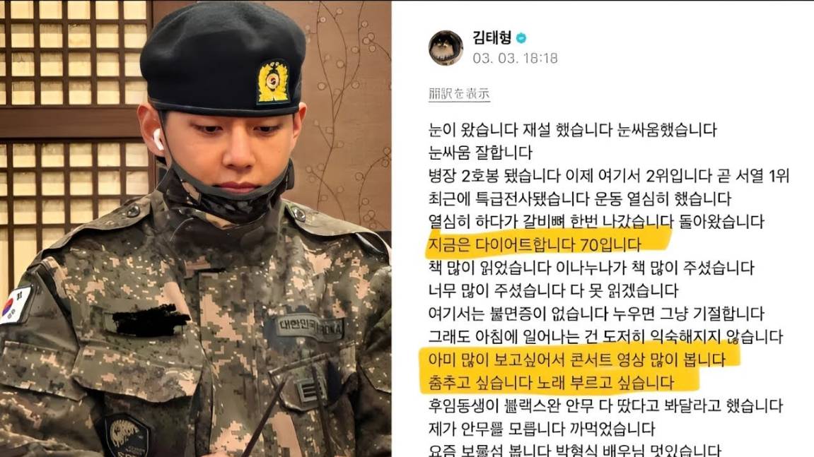 Сержант Тэхён только что рассказал, что получил перелом кости во время военных учений.