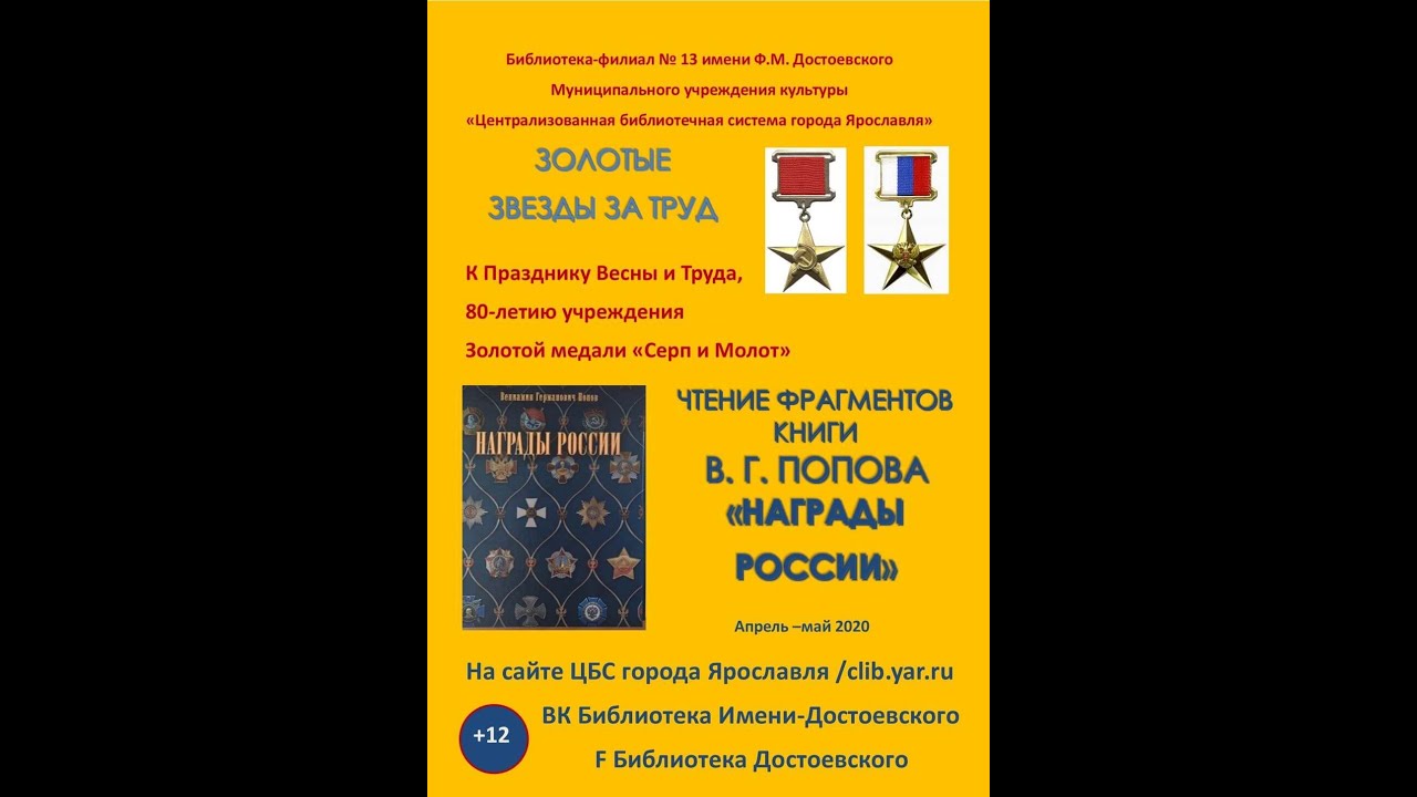 Продолжаем чтение книги Вениамина Попова «Награды России». Вы услышите фрагменты статей о золотых медалях «Серп и Молот», «Герой Труда Российской Федерации».