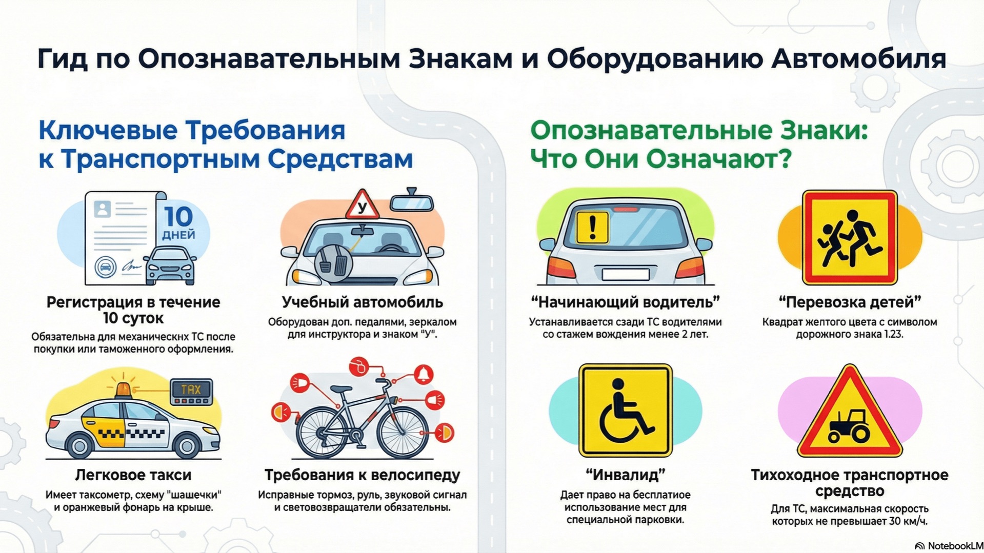 Основные положения по допуску транспортных средств к эксплуатации и обязанности должностных лиц по обеспечению безопасности дорожного движения Данный документ регламентирует основные положения по допуску транспортных средств к эксплуатации и обязанности должностных лиц по обеспечению безопасности дорожного движения, с учетом изменений, вступающих в силу с 1 января 2026 года. В нем изложены требования к регистрации механических транспортных средств и прицепов, а также к установке регистрационных знаков соответствующего образца. Важной частью является соответствие технического состояния и оборудования транспортных средств установленным стандартам безопасности и охраны окружающей среды. Документ детализирует необходимое оснащение для различных видов транспорта, включая сиденья для перевозки людей в грузовиках, ремни безопасности в междугородних автобусах и дополнительные элементы для учебных автомобилей. Также определены требования к такси, велосипедам и гужевым повозкам, касающиеся их безопасности и опознавательных элементов. Значительный раздел посвящен описанию обязательных опознавательных знаков, таких как «Перевозка детей», «Глухой водитель», «Учебное транспортное средство», «Опасный груз» и «Начинающий водитель», с указанием их дизайна и правил размещения. В заключение приводятся перечень и описание необязательных опознавательных знаков для водителей-врачей, инвалидов и транспортных средств ФСО. #БезопасностьДорожногоДвижения #ПравилаЭксплуатацииТС #ПДД #ОпознавательныеЗнаки #ТранспортныеСредства #ГИБДД #ДорожноеДвижение #Россия документ - https://t.me/autoanalitic подписаться - https://t.me/arxivpaperu отправить донаты: USDT: 0xAA7B976c6A9A7ccC97A3B55B7fb353b6Cc8D1ef7 BTC: bc1q8972egrt38f5ye5klv3yye0996k2jjsz2zthpr ETH: 0xAA7B976c6A9A7ccC97A3B55B7fb353b6Cc8D1ef7 SOL: DXnz1nd6oVm7evDJk25Z2wFSstEH8mcA1dzWDCVjUj9e создано с помощью NotebookLM