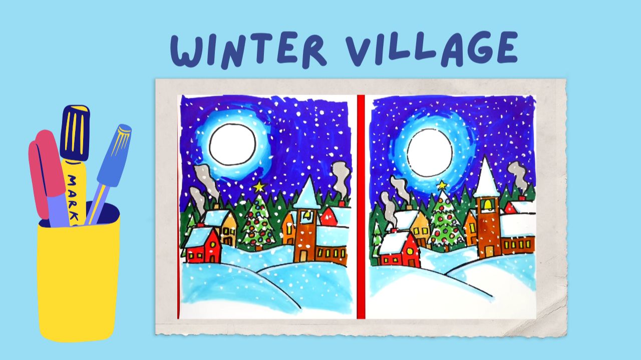 Let's draw a winter village together! Get a paper, pencil or marker and colored pencils or markers and follow the instructions. #Christmas #drawing #english