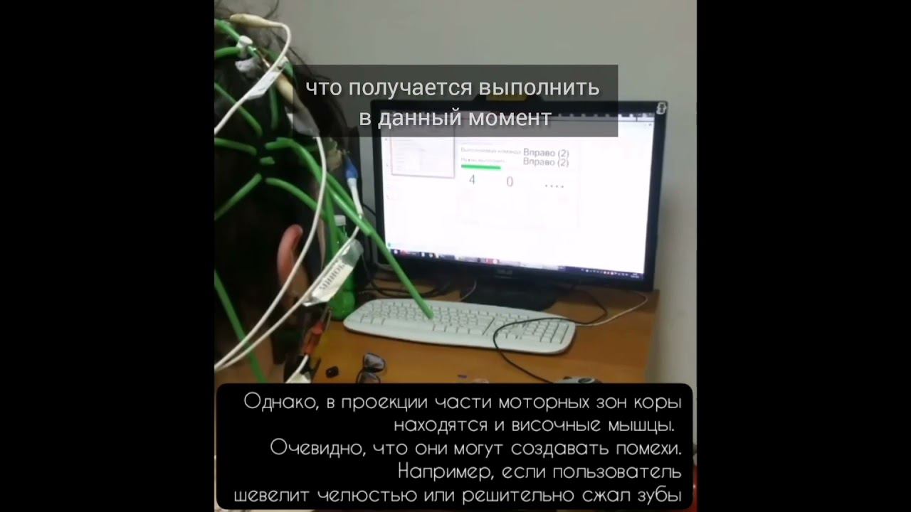 Испытуемый активностью височных мышц имитирует интерфейс мозг-компьютер на основе мю-ритма. т.о. показана возможность ошибочной интерпретации системами машинного обучения сигналов с мышц как сигналов ЭЭГ и формирования на их основе управляющих команд, имитирующих работу интерфейса мозг-компьютер, по факту являющиеся электромиографическим интерфейсом.