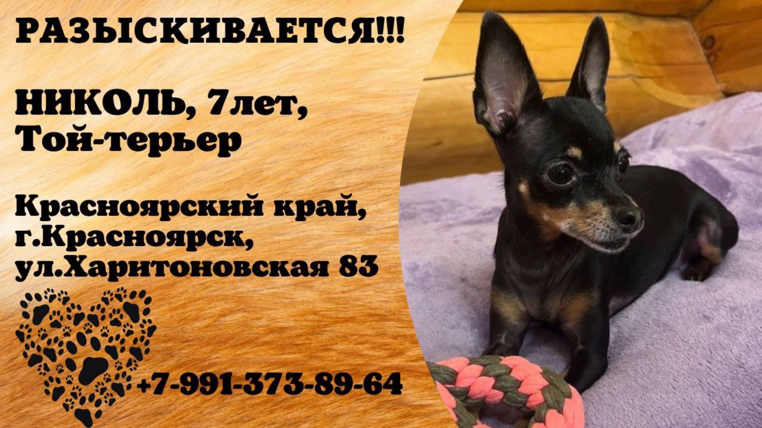 Пропала собака! НИКОЛЬ, 7 лет, той-терьер. Красноярский край, г.Красноярск.