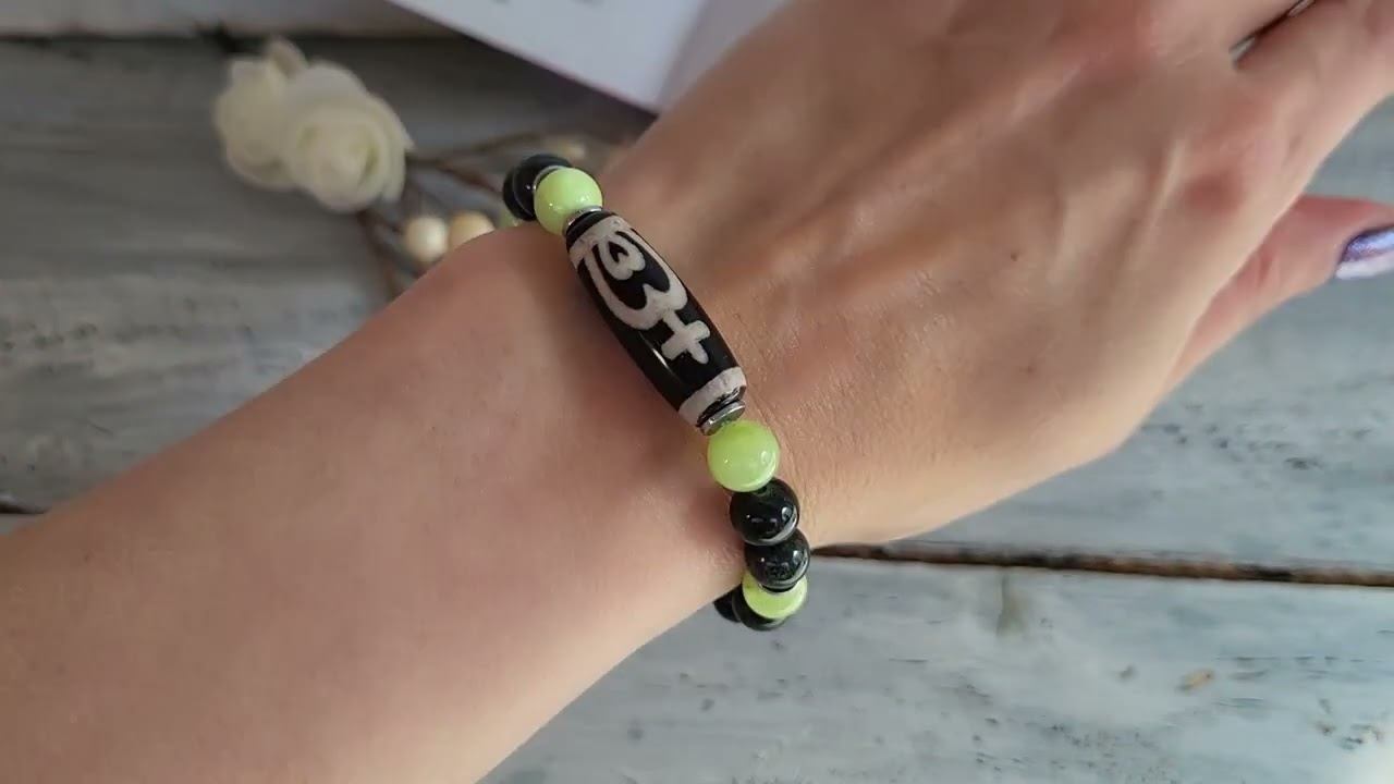 Браслет из змеевика, оникса, гематита с бусиной ДЗИ «Нектарный сосуд изобилия-Долгожительство», ДЗИ «Гаруда»: змеевик шарик 8 мм., оникс шарик 8 мм., гематит рондель 2х6 мм., бусина ДЗИ (агат) «Нектарный сосуд изобилия-Долгожительство» 10х30 мм., ДЗИ «Гаруда»10х14 мм., длина 18,5 см., на резинке. купить украшения можно в нашем магазине https://www.livemaster.ru/samotsvety-ot-granat-mk?view=profile