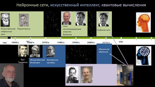 Ежов Александр Александрович Ученый секретарь, кандидат физико-математических наук Акционерное общество "Государственный научный центр Российской Федерации Троицкий институт инновационных и термоядерных исследований" (АО "ГНЦ РФ ТРИНИТИ") https://www.triniti.ru/company/staff/... Оригинал презентации https://disk.yandex.ru/i/G-5-5rMZJ6yX6A НЕЙРОИНФОРМАТИКА-2021 Международная научно-техническая конференция Yhttp://neuroinfo.ru/index.php/ru/ Тайминг 0:21 кто такой Александр Александрович Ежов. 1:00 первая конференция по нейронным сетям в Пущино. 2:30 1989 год первый учебник и курс для МИФИ. Сергей Александрович Шумский. 3:40 РПЦ направление на поддержку ИИ. 4:20 Цифровизация как главный термин вокруг которого крутится всё. "Зонтик" понятий. 6:46Джеффри Хи́нтон придумал глубокие нейронные сети. Помогли первые доступные БигДата. 8:20 2021 год 23 международная конференция по Нейроинформатике http://neuroinfo.ru/index.php/ru/ 9:28 1982 год пришёл физик Джон Джозеф Хопфилд и "Зима" в отрасли закончилась. "Спиновые стёкла". Содержательно адресованная память. Ассоциативная память. 13:18 когда и с кого всё началось. 1943 год. Всё началось с психолога. 15:15 нечёткая логика появилась в 70-ые 15:29 1956 год. Первая книга по нейрокибернетике "Исследование автоматов" публикуется в США и в этом же году переводиться, дополняется материалами советских кибернетиков и публикуется в СССР под названием "Автоматы". Выпускник МГУ переводчик Широков Феликс Владимирович и его роль в этом деле. И причём тут Станислав Лем. 18:05 Фрэнк Розенблатт психолог и нейробиолог. Персептроны и первые алгоритмы обучения нейронных сетей. Первые нейрокомпьютеры Марки 1,2,3,4. 19:00 Ученик Фрэнка Минский, Марвин Ли и первая "Зима" нейросетей в 1969 году. Экспертные системы вместо нейронных сетей. Появление термина "Искусственный Интеллект". Как врачи помешали развитию экспертных систем. 20:25 Пришёл лесник и ... привёл толпу коллег физиков. И началось... Наступила очередная Весна нейронных сетей и Зима экспертных систем. 25:50 А в это время советские биологи из Пущино позвали советских физиков объяснить что такое нейронные сети. 1988 и 1989 года иностранцы приезжают в Пущино и Москву смотреть что у нас. 5 главных вопросов конференции 88 года. 30:45 1999 год большая конференция в Вашингтоне. Ричард Фейнман и Юрий Манин. Закон Мура атомные размеры к 2020. 34:10 Стэнли Кубрик и Артур Кларк Одиссея 2010. Очередная Зима в ИИ. Нейронными сетями во всём мире опять нельзя заниматься и публиковать. А в СССР в это время проводят вторую дискуссию в МИФИ. 36:27 Кибернетикам в Советском Союзе работать никто не мешал. Машина БЭСМ 4 1964 года была лучшей в Европе. 37:20 Когда и почему мы стали отставать. Конец шестидесятых. Косыгинские реформы. Проект масштаба атомного. Два годовых бюджета на компьютеризацию и введение электронных денег. Глушко, Келдыш и Косыгин за. Голос Америки сделал мгновенный репортаж что КГБ готовит электронную систему слежки за всеми гражданами СССР и мира чтобы преследовать за политические убеждения. 40:30 Александр Александрович Ежов организует круглый стол в МИФИ 1999 год. Квантовые нейронные сети. 45:37 Шмидхубер, Юрген https://ru.wikipedia.org/wiki/Шмидхубер,_Юрген есть информация что именно он назначен научным руководителем искусственных нейронных сетей в РФ. 46:25 Обсуждение дрона-убийцы с искусственным интеллектом на осенней конференции в Москве. Смерть 3 законов робототехники Азимова. 50:17 Как обучать глубокие 