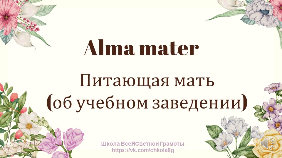 Школа ВсеЯСветной Грамоты https://vk.com/chkola8g В этом видео рассмотрим Этимологию Латинского выражения "Альма Матер" на русском и латинском языках. #Этимология #ВсеЯСветнаяГрамота #ВГ #ШколаВГ #etymology #Грамота #ЭтимологическийСловарь #ВсеЯСветная #латынь #учимграмоту #Альмаматер #мать