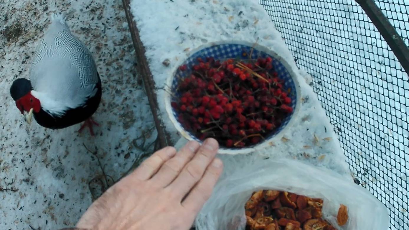 30.12.2024г. фазанам даю сушёные яблоки, мороженную рябину, барбарис и проростки зерносмеси. Птица содержится в открытых вольерах и без очков.
