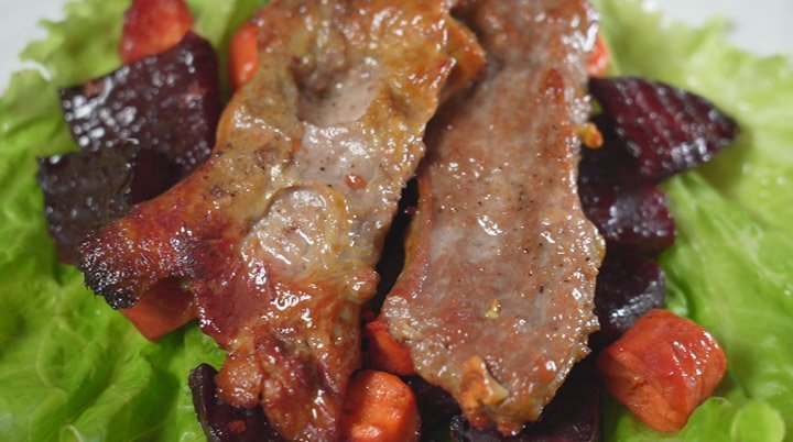 Простая кухня | Свинина, запечённая с овощами Рецепт: · Свиная шейка - 400 г · Свёкла - 200 г · Морковь - 200 г · Чеснок - 10 зуб. · Соль - по вкусу · Перец чёрный - по вкусу · Масло растительное - 1 ст. л.