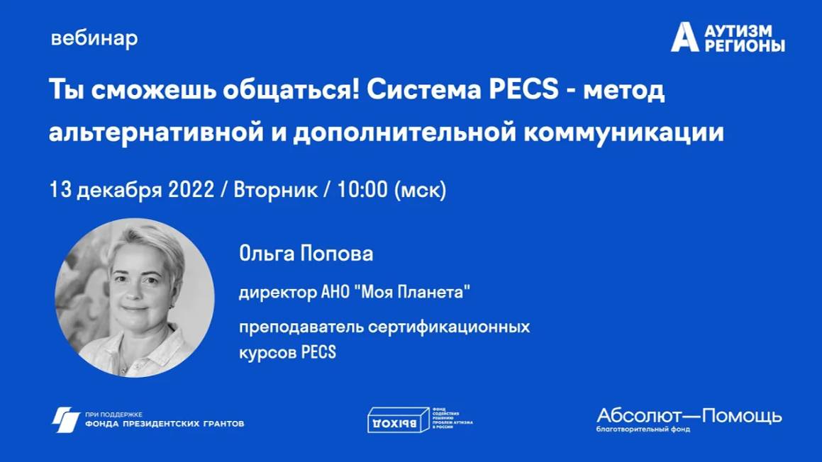 Ты сможешь общаться! Система PECS - метод альтернативной и дополнительной коммуникации 13 декабря 2022 года вебинар Система Picture Exchange Communication System® (PECS®) – это научно-доказанная методика, используемая для быстрого обучения навыкам общения людей с функциональными нарушениями речи. Протокол PECS® используется сотнями тысяч профессионалов во всем мире. С 2020 года методика PECS входит в список клинических рекомендаций Минздрава РФ для детей с расстройствами аутистического спектра (РАС). Во вторник, 13 декабря Ольга Попова, директор АНО "Моя Планета", преподаватель сертификационных курсов PECS в РФ и мама ребёнка с РАС, пользователя PECS, представила суть методики и показала видеопримеры по каждому из 6 этапов обучения. Презентацию можно скачать по ссылке https://drive.google.com/file/d/1C0FCyi4nr6q5oplwl9vLBF9ERKYO4ufq/view?usp=sharing Организатор проекта "НИИ - НАУКА И ИНКЛЮЗИЯ" - Ассоциация "Аутизм - Регионы". Проект реализуется при поддержке фонда "Выход" и благотворительного фонда "Абсолют-Помощь" с использованием гранта Президента Российской Федерации на развитие гражданского общества, предоставленного Фондом президентских грантов.