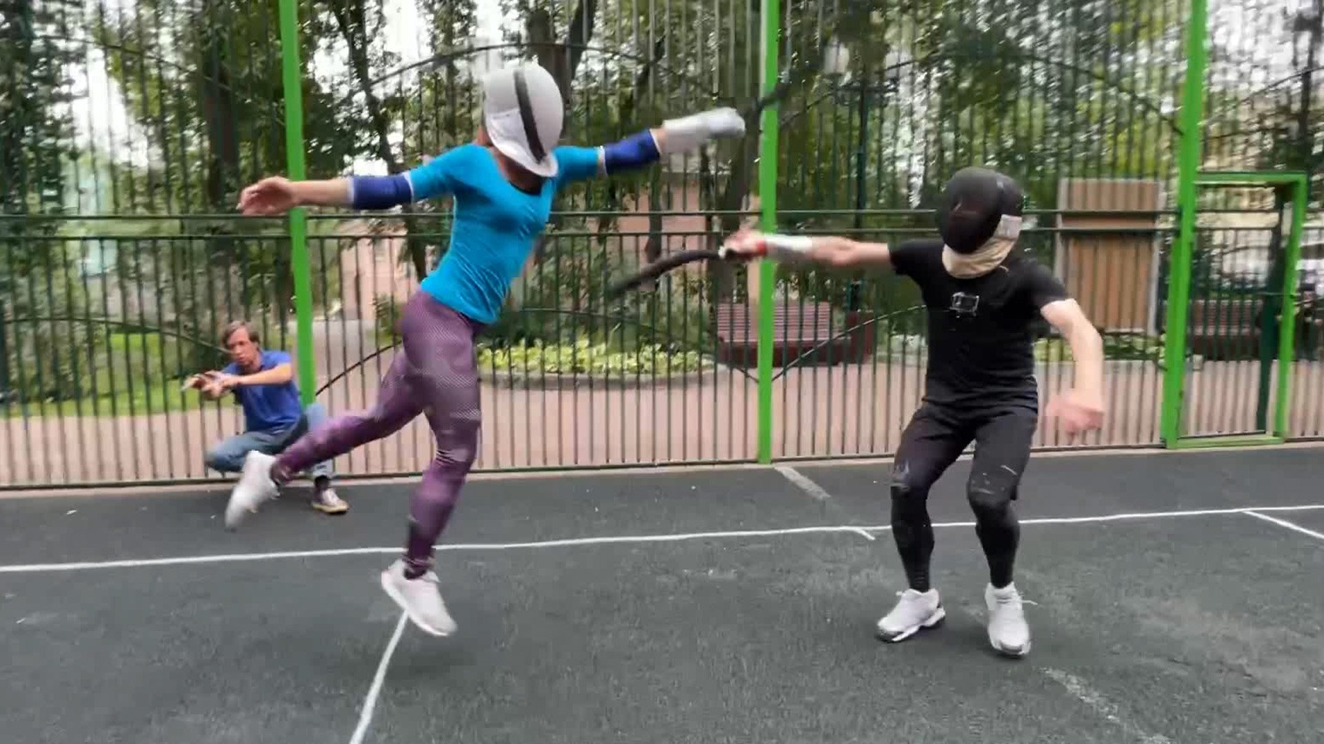 Урок фехтования кендзюцу - учебный спарринг на коротких мечах летом на улице